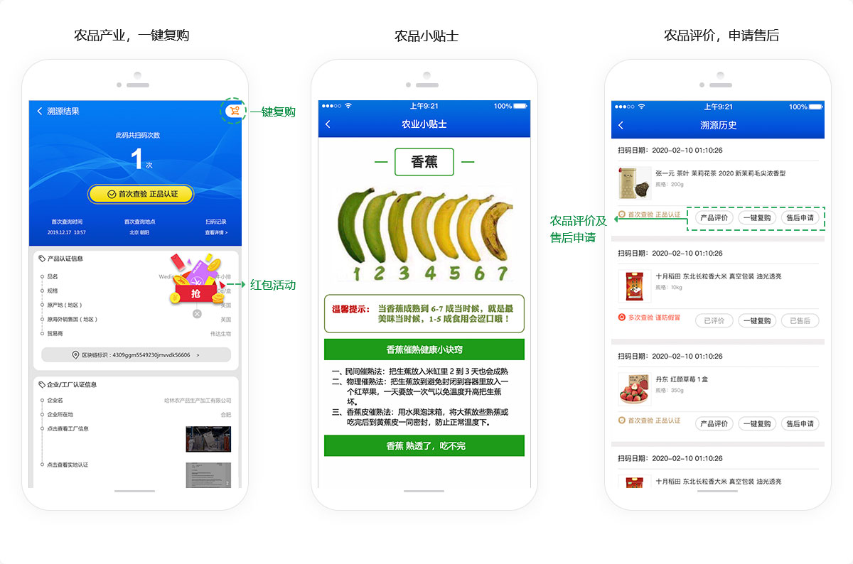 消費(fèi)者掃碼溯源終端,溯源與營(yíng)銷一體化的全鏈溯源方案,幫助品牌商里鏈接消費(fèi)者提供一建復(fù)購(gòu)、農(nóng)品小貼士等,防止流量外流、維護(hù)粉絲群。
