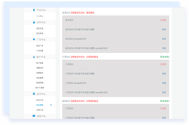 此外互融云OTC場外交易系統(tǒng)中還提供了多種付款方式,支持銀行卡、微信、支付寶三種方式,同時,為了保證平臺用戶賬號安全性還提供了交易密碼、短信驗(yàn)證、google驗(yàn)證碼等多種安全策略校驗(yàn),通過多種功能和安全策略的結(jié)合為交易雙方保駕護(hù)航。