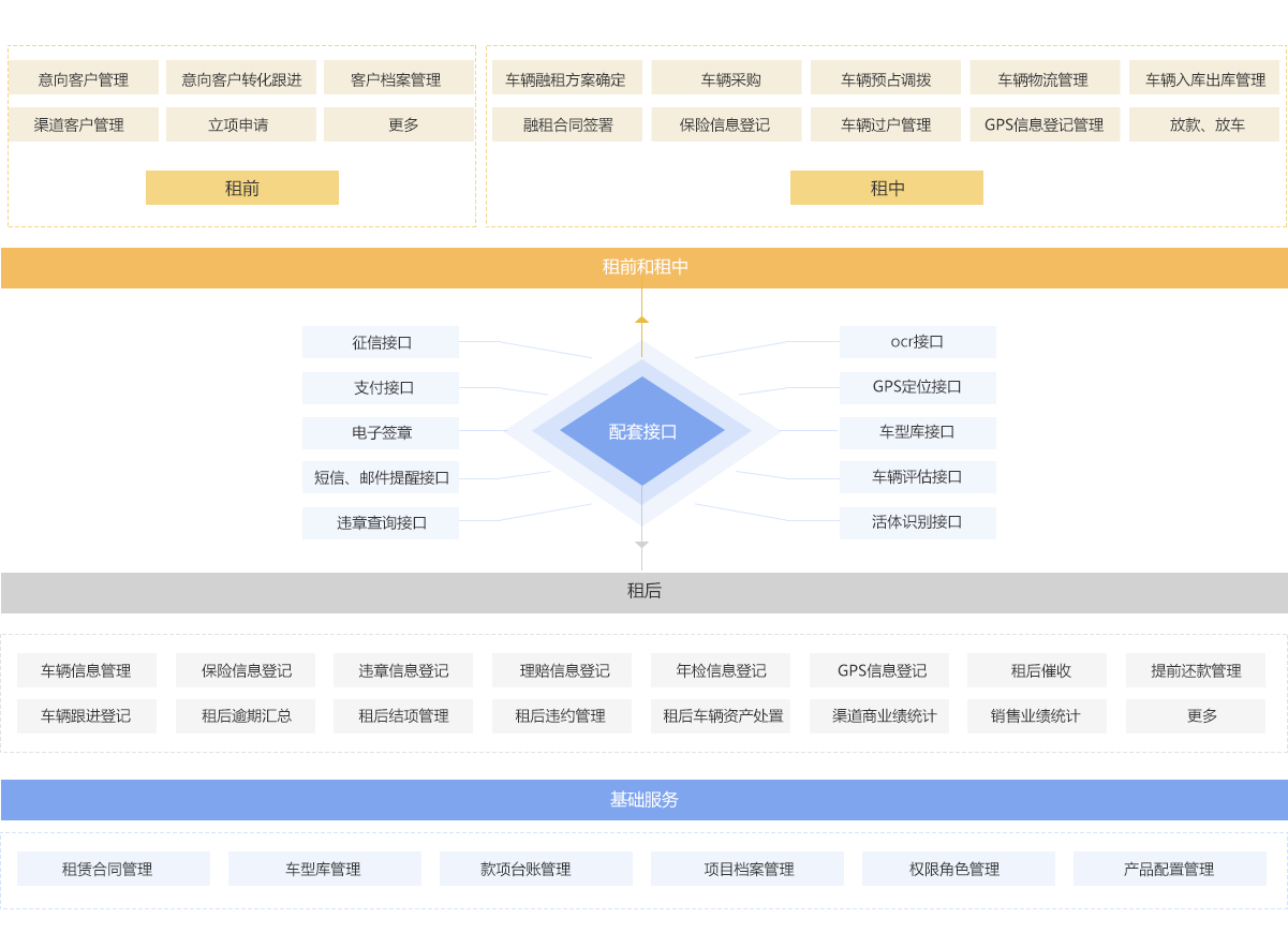 系統(tǒng)開展租前、租中、租后業(yè)務(wù)流轉(zhuǎn)過(guò)程中,通過(guò)引入多家三方集成,提高業(yè)務(wù)的運(yùn)營(yíng)效率。