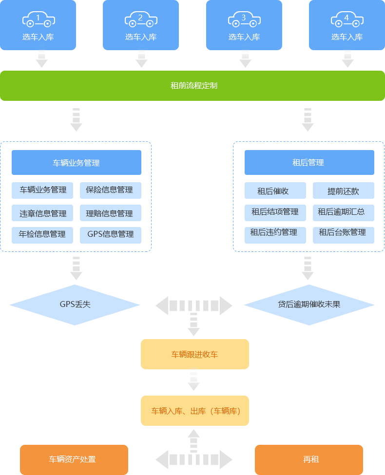 系統(tǒng)支持租賃車輛全流程化管理,整個(gè)車輛的融資租賃業(yè)務(wù)正常業(yè)務(wù)線、非正常業(yè)務(wù)線流程都形成閉環(huán)管理。