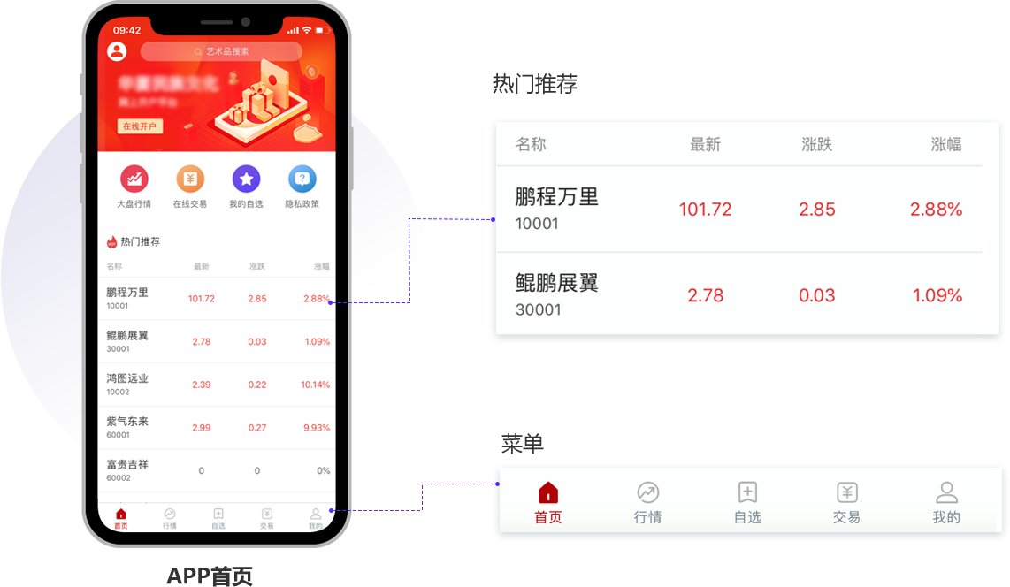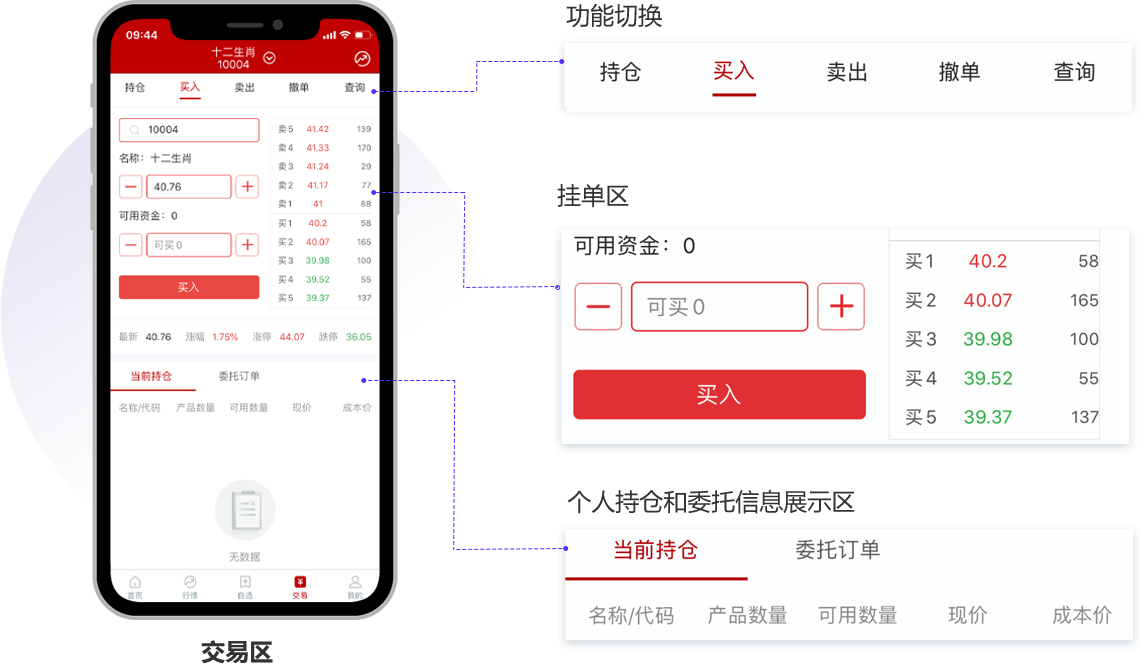 APP主要包含大盤行情、在線交易、自選、潮品K線、分時圖、包括限價/市價買賣。