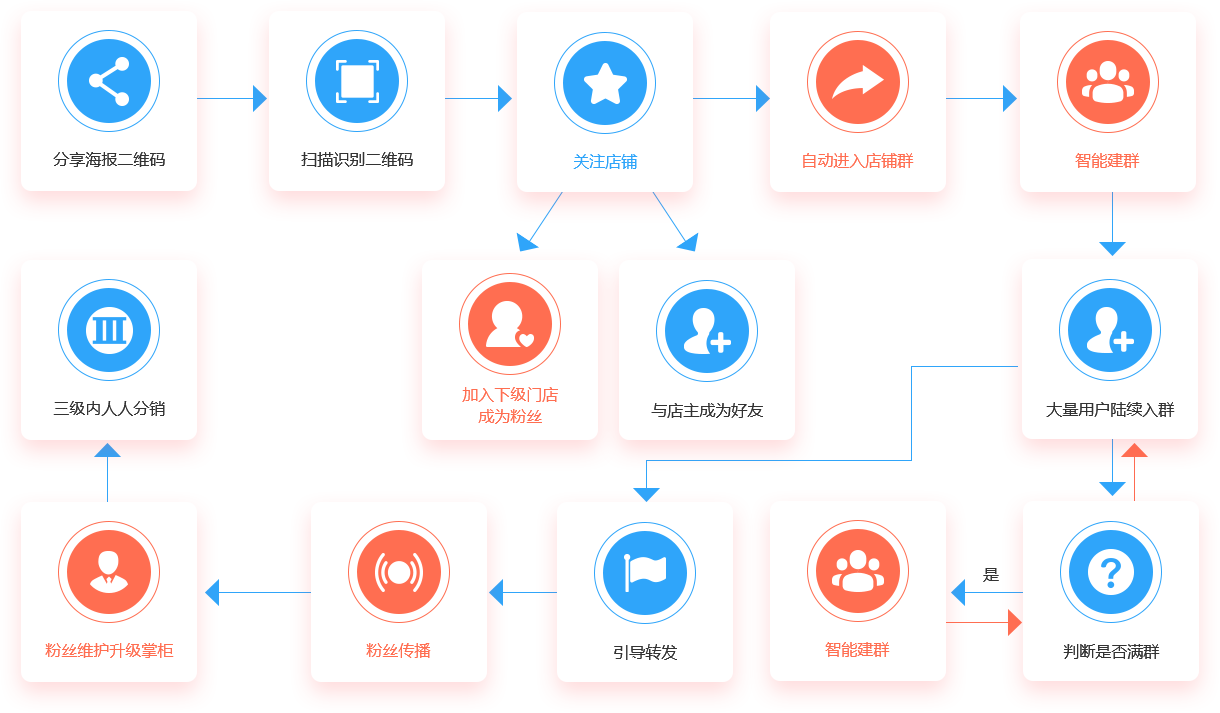 通過海報群裂變?nèi)肴?,系統(tǒng)自動建群,群滿后自動切換新群,無需手動建群,防止因群滿而無法進(jìn)群丟失大量用戶情況裂變的同時加大了推廣分銷力度,高效裂變,提升店鋪銷量,以低成本甚至免費的方式實現(xiàn)單日裂變數(shù)萬粉絲,用戶增長迅速