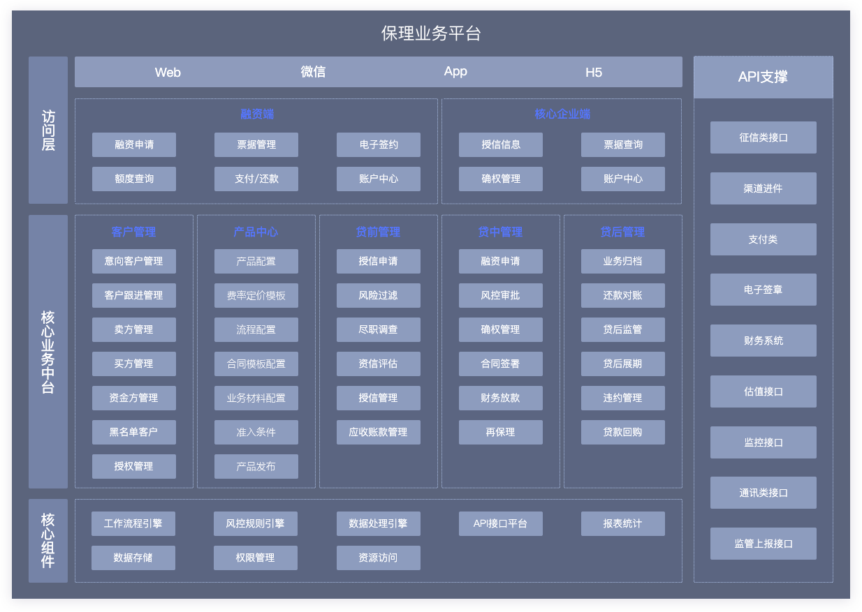 系統(tǒng)支持全業(yè)務(wù)流程的三方數(shù)據(jù)服務(wù),包括風(fēng)控規(guī)則引擎、權(quán)威的人行二代征信、發(fā)票驗(yàn)真、中登網(wǎng)查詢、企業(yè)資信評(píng)估等服務(wù),為企業(yè)一站式風(fēng)控解決方案,實(shí)現(xiàn)快速盡調(diào)、快速授信、快速審批。