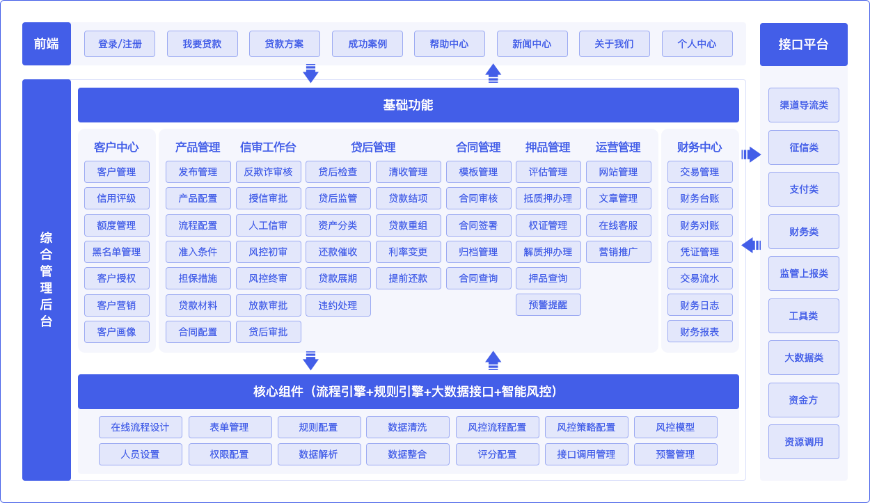 在滿足基礎(chǔ)服務(wù)的基礎(chǔ)上,傾力打造規(guī)則引擎,接入權(quán)威的人行二代征信及百行征信,通過可視化流程管理,智能數(shù)據(jù)決策分析、強(qiáng)大的風(fēng)控體系讓您的業(yè)務(wù)更智慧更高效。幫助小額貸款公司完善業(yè)務(wù)、合理規(guī)劃管理、把控風(fēng)險(xiǎn)、減少貸款壞賬率?;阢y行系統(tǒng)架構(gòu)設(shè)計(jì),功能全面,多終端覆蓋, 提供PC+APP(android/ios)全終端產(chǎn)品系統(tǒng),快速交付,節(jié)約成本。