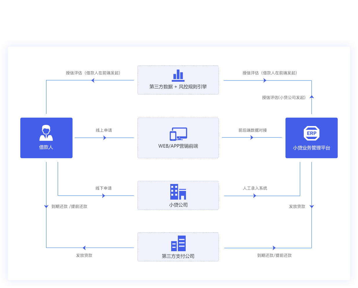 互融云小額貸款系統(tǒng)是一款高端綜合貸款管理系統(tǒng),致力于解決傳統(tǒng) 貸款貸款管理混亂、效率低、成本高等問題,根據(jù)小額貸款公司業(yè)務(wù)管理需求 ,為客戶提供成熟的全流程化貸前、貸中、貸后管理的解決方案。