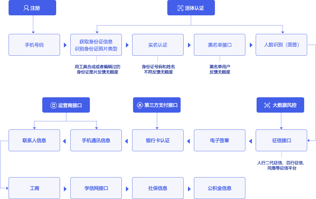 1、個(gè)人信用風(fēng)險(xiǎn)評(píng)估:人行征信、實(shí)名認(rèn)證、借款人信息詳情、反欺詐驗(yàn)證