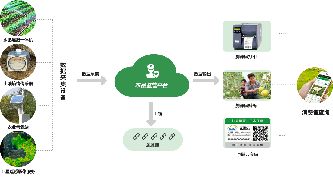 互融云農(nóng)產(chǎn)品溯源平系統(tǒng)是結(jié)合農(nóng)業(yè)行業(yè)的特點(diǎn)而研發(fā)的以追溯、營(yíng)銷為一體的區(qū)塊鏈智慧溯源平臺(tái)系統(tǒng);系統(tǒng)以物聯(lián)網(wǎng)設(shè)施搭建與采集、區(qū)塊鏈追溯信息存儲(chǔ)、農(nóng)品追溯管理、溯源碼追溯管理、環(huán)境監(jiān)測(cè)追溯管理、農(nóng)品營(yíng)銷管理為核心的溯源平臺(tái);系統(tǒng)集成物聯(lián)網(wǎng)設(shè)施采集農(nóng)品追溯信息包括土壤墑情傳感器、水肥灌溉一體機(jī)、農(nóng)業(yè)氣象站、監(jiān)控?cái)z像頭、智能播種機(jī)、水肥灌溉一體機(jī)、農(nóng)業(yè)無人機(jī)、拍照式蟲情測(cè)報(bào)燈、智能溫室大棚、AGV物流小車、衛(wèi)星遙感影像等先進(jìn)的設(shè)備。系統(tǒng)將采集數(shù)據(jù)上鏈區(qū)塊鏈,保證追溯信息的可信提升品牌公信力。