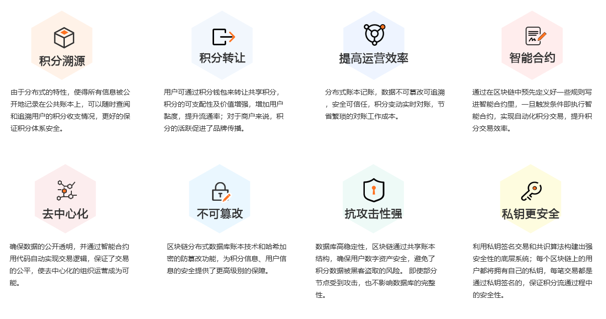 此外,區(qū)塊鏈作為一種不可篡改的分布式數(shù)據(jù)庫(kù)賬本技術(shù),擁有共享賬本結(jié)構(gòu)、私鑰簽名交易和共識(shí)算法等技術(shù)特點(diǎn),其存儲(chǔ)的數(shù)據(jù)分布于網(wǎng)絡(luò)的每一個(gè)節(jié)點(diǎn),從而決定了其安全性。每一個(gè)區(qū)塊鏈上的用戶都將擁有自己的私鑰,每一筆交易都是通過(guò)私鑰簽名的,經(jīng)過(guò)全網(wǎng)節(jié)點(diǎn)認(rèn)證后方可存入?yún)^(qū)塊鏈,并且一經(jīng)存儲(chǔ)將不得修改,保證流通過(guò)程中的安全性, 旨在為用戶提供一個(gè)更安全、更便捷、可用性更強(qiáng)的用戶積分系統(tǒng),打破傳統(tǒng)的積分使用障礙。