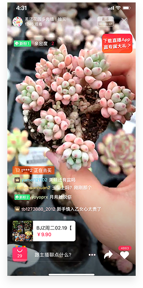 直播間觀眾席的設置、觀看人數、評論點贊數及點贊動畫、活動入口鏈接等,都在傳遞直播間很火爆的氣氛。