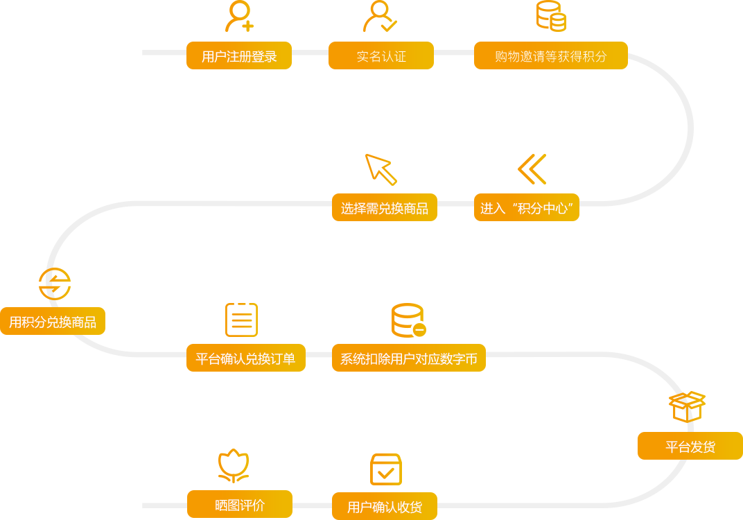 用戶在購買商品的同時,平臺會按照幣值(積分價值與人民幣的比率)返回給用戶對應的積分返利。訂單完成后, 用戶即可使用積分,進行商品競拍、轉出、限時搶購等活動。