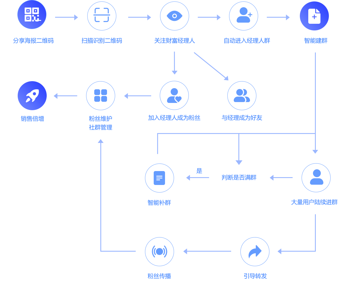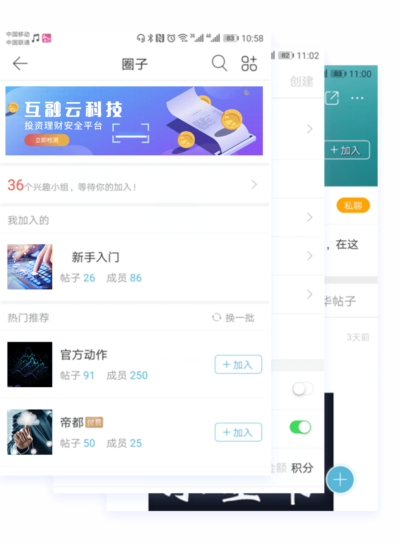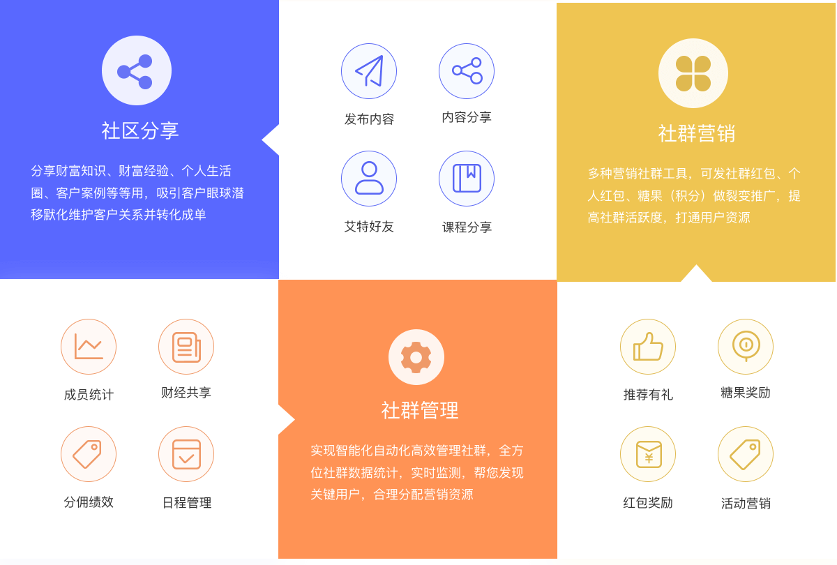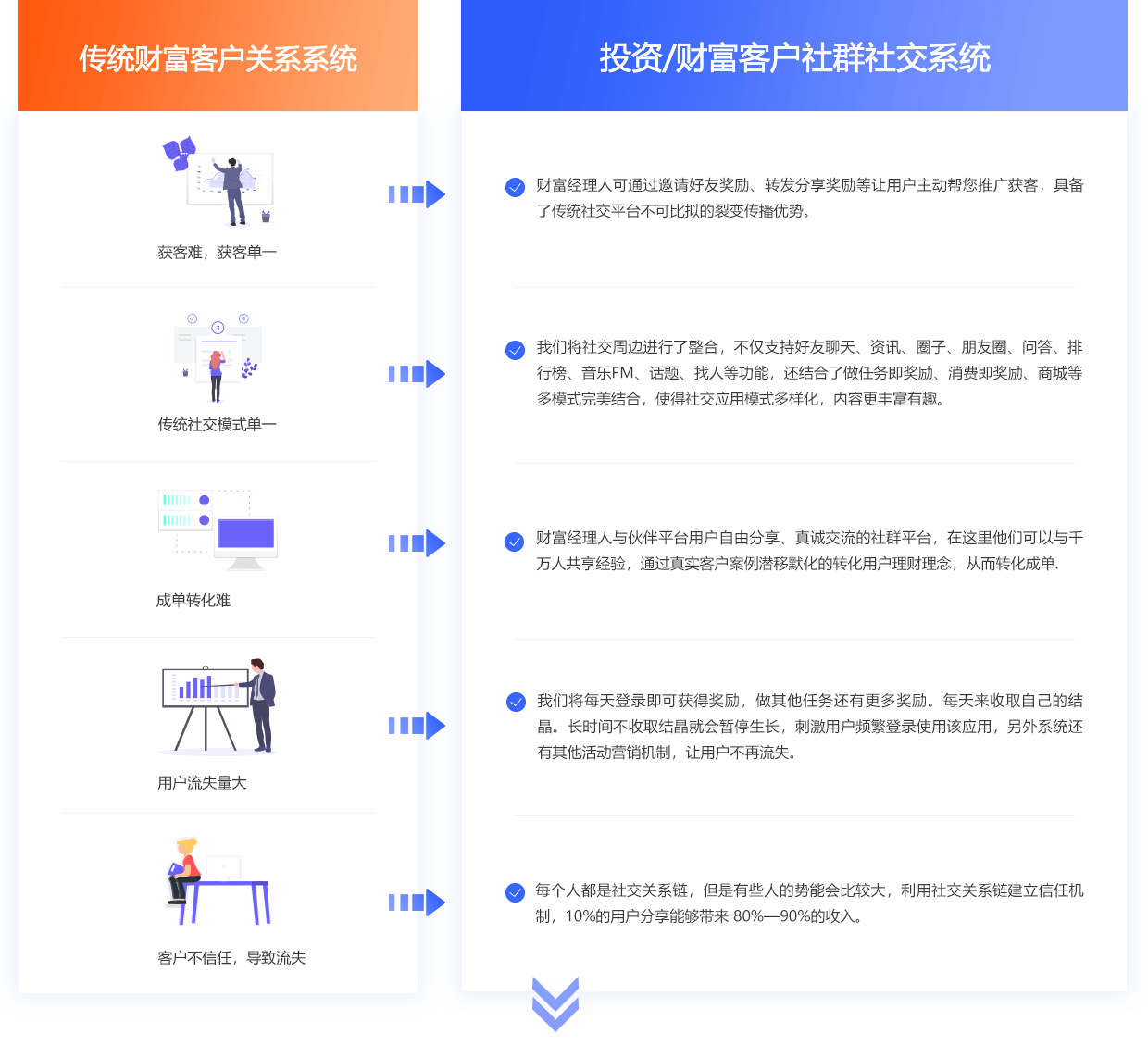 互融云積累多年實施財富管理、投資客戶關系管理系統的基礎上,秉承推陳出新理念大膽創新的將投資客戶關系+社交+社群的模式結合在一起,研發出一款投資/財富客戶社群社交系統,此系統是建立在社區、社群、粉絲基礎上的,并結合財富產品、投資客戶關系維護的業務模式,開發的一款集社交、社群的財富社群系統。我們將社交周邊進行了整合,不僅支持好友聊天、資訊、圈子、社區朋友圈、問答、排行榜、音樂FM、話題、找人等功能,將我們投資客戶更好的維系在社群中,更推出了適合財富的財富學院板塊,使財富經理人更多的通過線上傳播財富的理念,內容更豐富有知識含量,幫助類財富投資企業開展社群營銷模式,裂變推廣拉新促活,開啟社群經濟紅利時代。