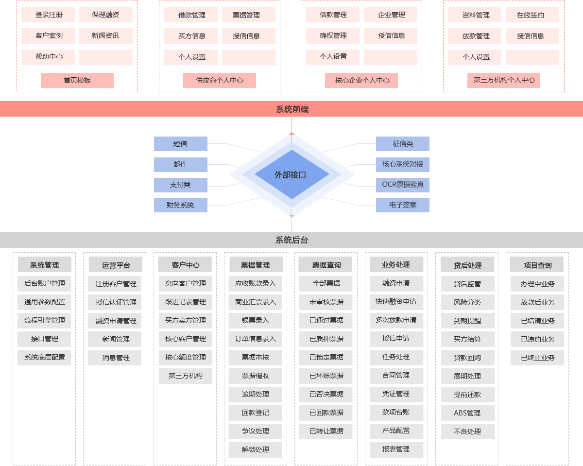 系統還包括:業務管理、票據管理、票據查詢、貸后管理、保理臺賬、業務查詢、風控管理、網站內容管理、運營管理等基本功能板塊。