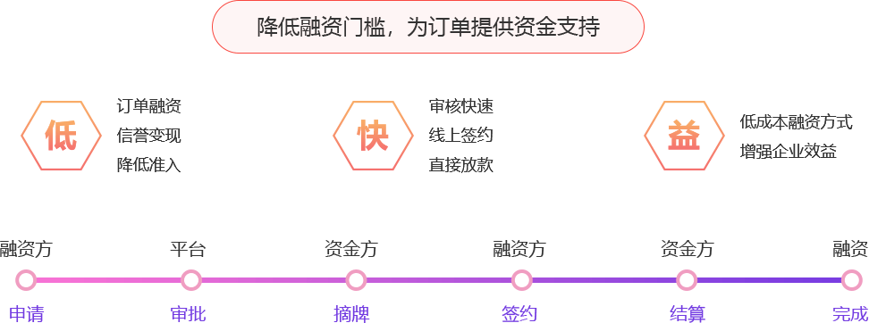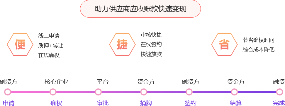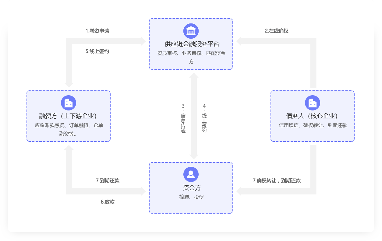 N+核心企業、N+上下游企業、N+資金方參與,線上發布、確權、摘牌、簽約,幫助融資方快速解決融資難題