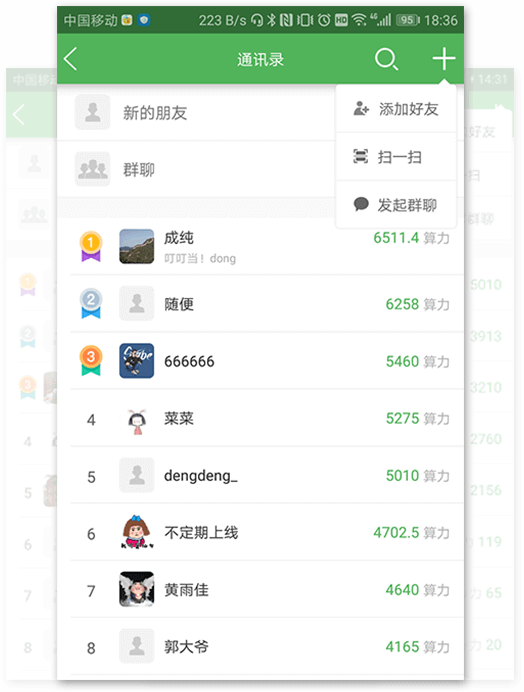 根據用戶數據,將好友圈的算力排行由高到底展示,通過激發用戶的競爭意識來提高用戶參與度