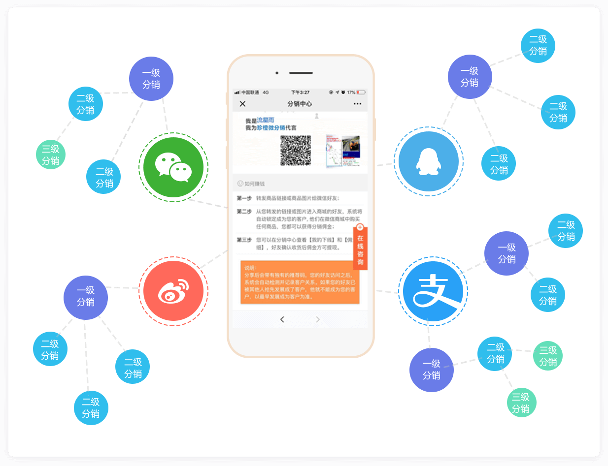 通過微信、QQ、微博等社交平臺進行分享,推薦人能獲得交易傭金。而用戶通過對店鋪推廣和傳播,將吸引更多用戶成為分銷商,真正激活社交圈,分銷渠道呈幾何倍數增長